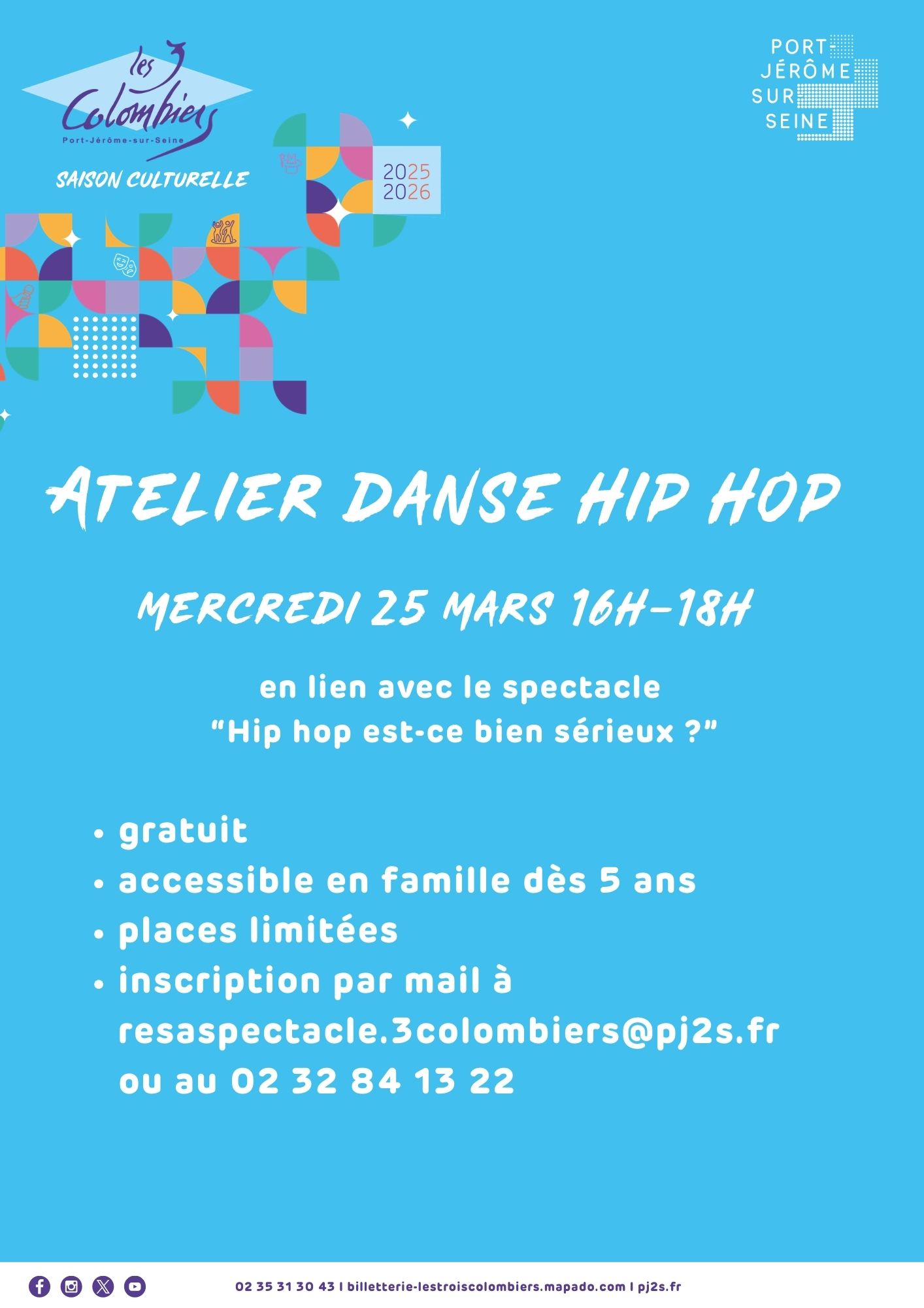 Dans le cadre du spectacle « Hip hop est-ce bien sérieux » programmé le jeudi 26 mars, nous vous invitons à découvrir la danse hip hop lors d’un atelier gratuit le mercredi 25 mars de 16h à 18h : accessible en famille dès 5 ans, cette initiation ne demande aucune connaissance dans le domaine, l’idée étant de passer un bon moment et, pourquoi pas, se révéler une passion pour la danse hip hop ?!