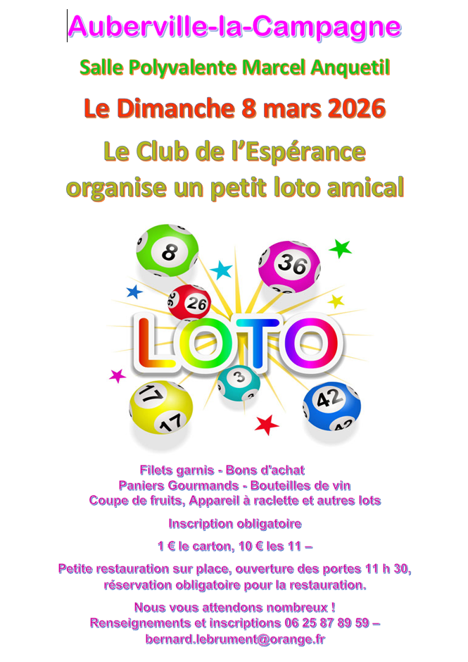 Salle Polyvalente Marcel Anquetil rue du bourg, Auberville-la-Campagne, FranceLoto Amical le 8 mars 2026, organisé par le Club de l'Espérance d'Auberville la Campagne, salle Polyvalente Marcel Anquetil. Ouverture des portes à partir de 11 heures 30 Horaires 14 […]